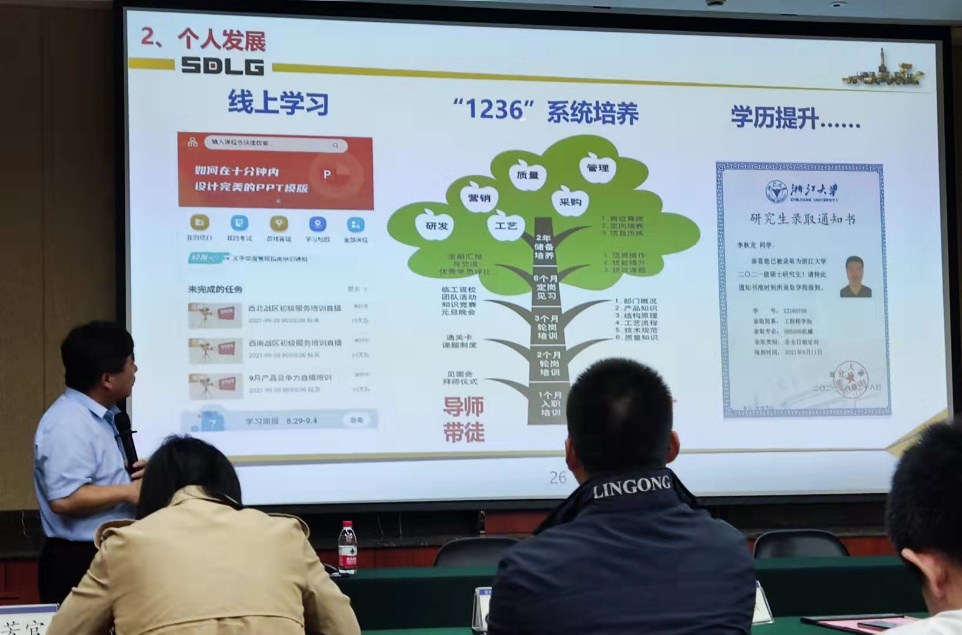 针对于员工的培养,山东临工对新入职的员工首年采用1236系统培养模式。并提供学历提升机会,进入国内、国际高校攻读更高学位机会。在薪酬福利方面,临工实行区域领先薪酬策略,多方面保证员工的福利。通过多名临工员工的个人发展经历展示,同学们也对加入临工后的个人发展认识更加清晰。同时临工也注重员工的文化生活活动,举办了多彩的文化活动,体育运动比赛等等。最后,展示了各个研究院的工作方向以及专业需求,使同学们投递更加准确高效。