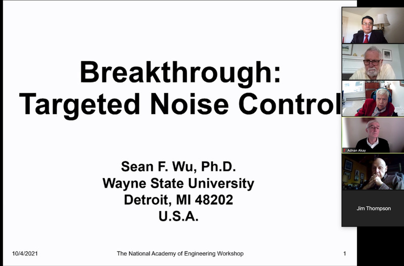 此次专题讨论会美国国家工程院特别邀请韦恩州立大学杰出教授、浙江大学机械工程学院精密制造专业1982届校友邬晓锋博士作《噪声控制最新突破:靶向噪声控制》(Breakthrough: Targeted Noise Control)专题报告。