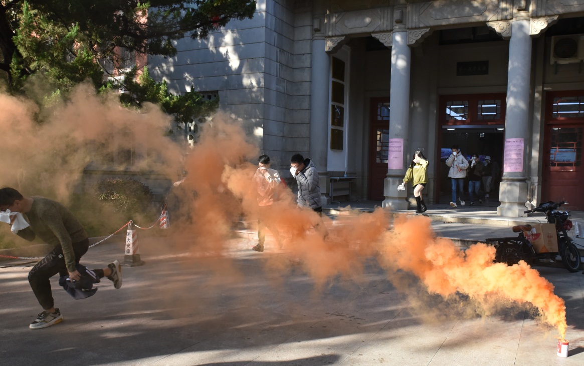 下午3点,随着消防烟雾弹被点燃,机械工程学院消防安全演练正式开始,第一教学楼的所有人员在各引导员的指挥下,手拿湿毛巾,捂住口鼻,降低重心,动作迅速、安全有序的撤离了教学楼,并在毛像前的大草坪前集合。