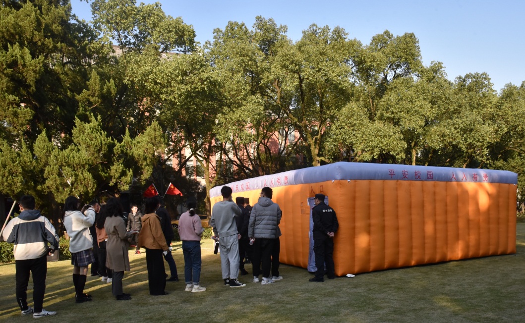学院在大草坪上搭建了模拟烟雾逃生体验馆和电子模拟灭火装置,师生们在专业人员的指导下,按照四人一组和两人一组分别参加了模拟烟雾逃生和模拟灭火演练,通过实战演练,老师和同学们进一步提高了自身消防安全能力,更全面地掌握了相关消防安全知识。