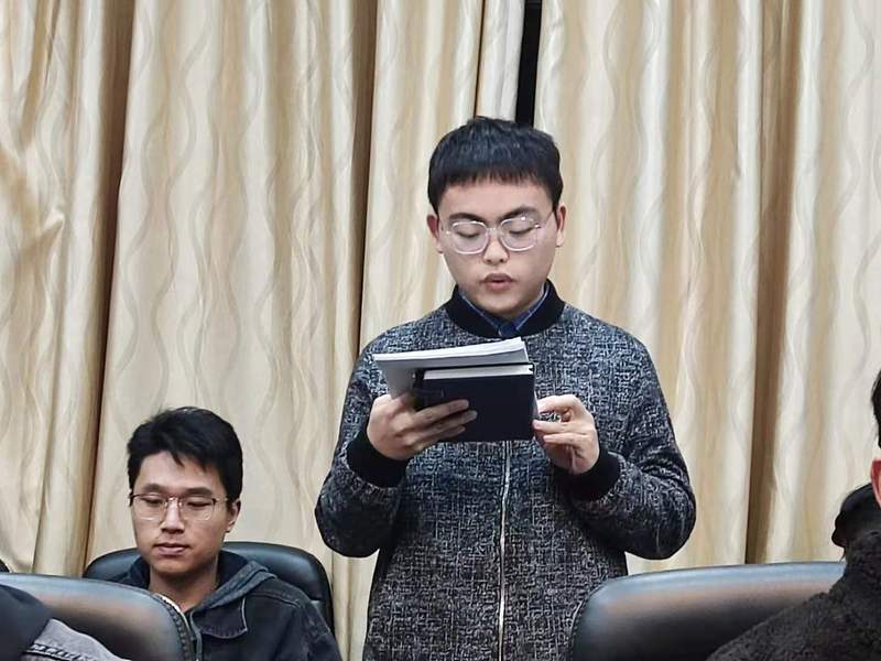 首先,申请转正的张中坛、吴凯两位预备党员按照规定顺序宣读转正申请书,汇报自身在一年预备期中的表现。从汇报情况可以看出,在一年的预备期中,这两位预备党员均严格以党员标准要求自己,在学习上努力刻苦,并积极帮助身边同学;他们在各种学生社团或组织中担任要职,成为内部的中流砥柱,用实际行动服务群众;同时他们积极参与各类学科竞赛,取得良好成绩为支部、为学校争光。但是,这些同志也充分注意到自身还存在时间管理能力不足、基础理论储备不扎实等问题。