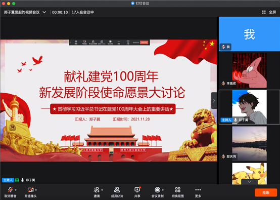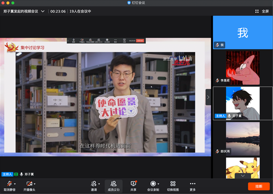 11月28日晚上7点,郑子翼同学通过钉钉会议的方式主持开展了机械工程1907团支部“使命愿景大讨论”线上主题班会。