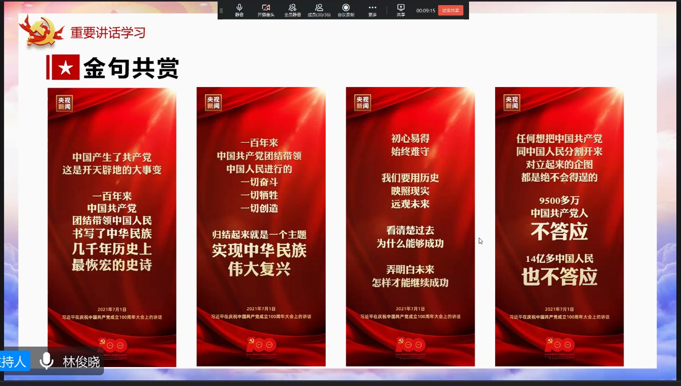 为深入学习贯彻习近平总书记在庆祝中国共产党成立100周年大会上的重要讲话精神,巩固和发展党史学习教育成果,11月26日晚上7点,机械工程1904班举办了“新发展阶段使命愿景大讨论”主题班会线上会议。班主任李立新参加本次活动,主持人为团支书林俊晓。