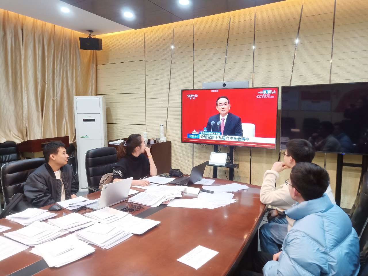 随后,我们集体观看了这次会议的回放视频,图1为观看视频时的场景。通过观看视频,我们充分认识了十九届六中全会精神的深刻内涵和重大意义,也对持续深入推进十九届六中全会精神学习宣传贯彻工作有了理解。