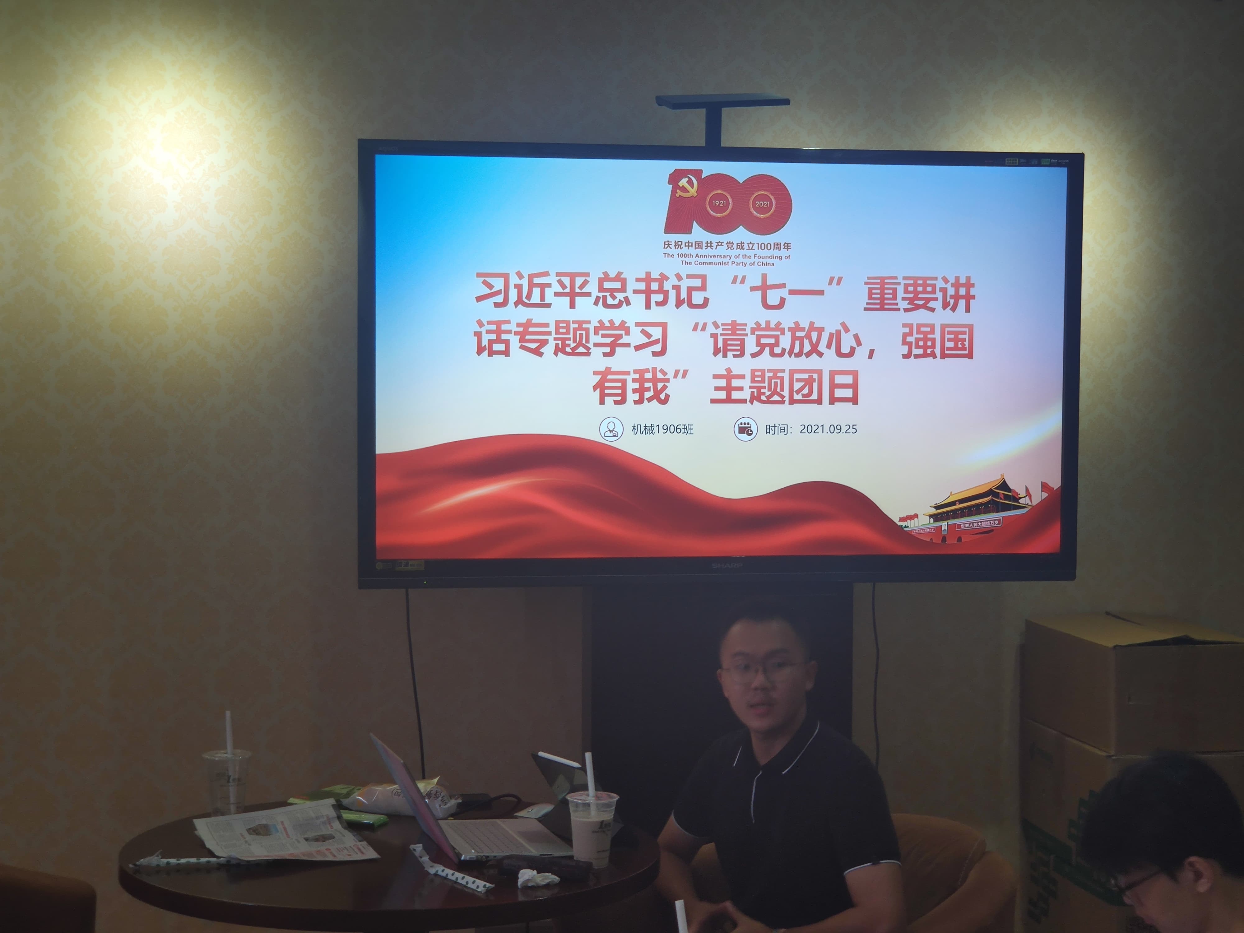 为进一步加深对习近平总书记“七一”重要讲话的重大意义、伟大建党精神、百年伟大成就、奋进新时代开启新征程等的理解,机械工程1906团支部就习近平总书记“七一”重要讲话,9月25日于9玉泉教一-319会议室开展了学习“请党放心,强国有我”主题团日班会,并进行了入党积极分子推优。本次班会由团支书石大杭主持,1906团支部大部分学生参与。