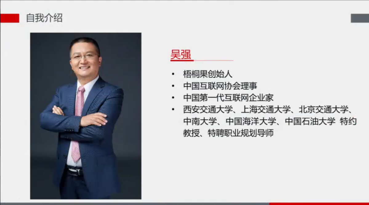 首先,吴老师从我愿意做、我能做和我适合做三个部分对将职业定位模型进行讲解。在“我愿意做”部分,吴老师描述了职业兴趣和职业价值观两者的联系和区别。职业兴趣是“个人喜欢什么”,而职业价值观是“个人重视什么”。吴老师以同事的职业情况和自己大学期间以及毕业后的职业发展为例,表述出一个人的职业兴趣在不同时期是可以转化的,而职业价值观在价值观形成过后会保持相对稳定。通过利用霍兰德职业兴趣测试和WWI职业价值观测试两个工具,同学们可以大致判断自己的职业兴趣类型和职业价值观。进而匹配到合适的岗位。在“我能做什么”部分。吴老师讲到一个人的职业能力可以由智力、能力倾向和情商三部分构成。同学们可以通过后天的努力,来不断增强自己的能力。以便于我们在就职过程中具有更强的竞争力。“我适合做”部分主要的内容是一个人的气质和性格对职业的影响。吴老师利用老罗的个人经历为例,分析了一个人的性格对职业类型的影响。当前社会有各种各样的工作,相应的也适合于各种各样特定的性格。例如,一名成功的企业家大概率具有脚踏实地、善于人际管理等特性。同学们可以通过MBTI模型测试来大致判断自己的性格,以便于选择出适合自己的工作,让自己的人生价值能够得到更好的体现。