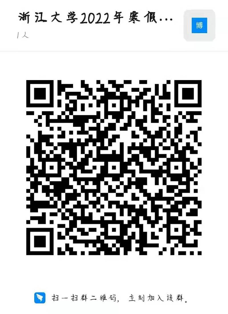 (二)请大家关注浙江大学团委官方微信“zju-tw”和浙江大学社会实践官方微信号“zjushsj”了解社会实践动态详情。 请各寒假社会实践学生负责人于1月12日前扫码加入浙江大学2022年寒假大学生社会实践活动钉钉群,实践过程中有疑问可群里进行咨询。同时,各位对社会实践立项有疑问的同学,可以加入机械2022寒假社会实践交流群(QQ群:780202080)反馈。