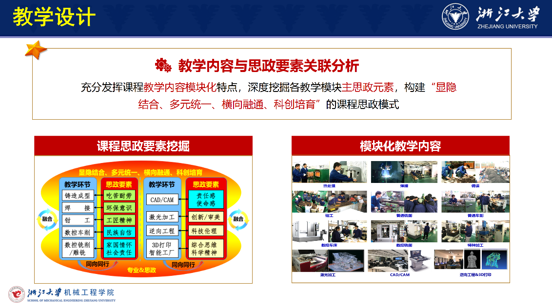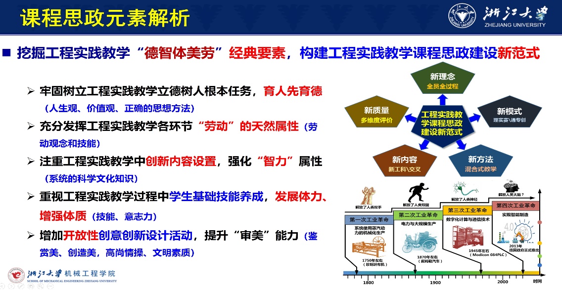 最后,徐老师指出课程思政建设是一项系统性、长期性、动态性工程,需要持续不断挖掘思政元素,更要持续不断更新思政内容,善讲身边事、身边人等思政故事,还要把握思政元素与专业内容的结合度,潜移默化、润物无声。工程实践类课程拥有课程思政教育的天然属性,既要发挥该类课程劳动教育的固有属性,又要充分融合德、智、体、美育人任务,构建德智体美劳全面培养的高水平育人体系,实现道德修养、家国情怀、全球关切、浙大精神四个层面的思政建设全面落实。