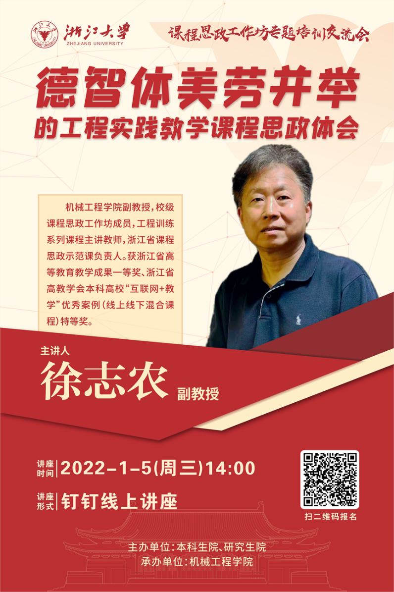 2022年1月5日下午,由本科生院、研究生院主办,机械工程学院承办的课程思政工作坊专题培训交流会——德智体美劳并举的工程实践教学课程思政体会在“浙大钉”平台顺利举办。
