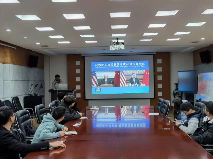 随后,朱恒双带领大家观看习总书记和美国总统拜登的视频会晤内容。这次会晤两国元首谈到的都是事关中美关系未来的、很重大的战略性问题,还有双方共同关心的、关切的问题,这次会晤的主要内容可以概括为“3421”,也就是习近平主席就发展中美关系提出了“三点原则”和“四个方面的优先事项”,两国领导人达成了“两个原则共识”,习近平主席就“一个重要问题”深入做了美方工作。