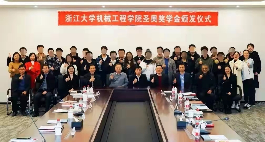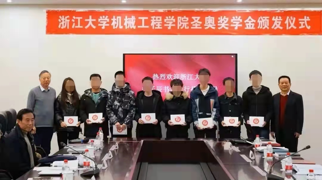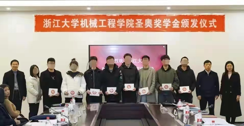 随后,俞磊老师宣读了获得2021年度圣奥奖学金的20位学生名单,倪良正先生、郑明治先生、陈子辰教授、居冰峰教授、项淑芳老师共同为获奖学生颁奖,并合影留念。