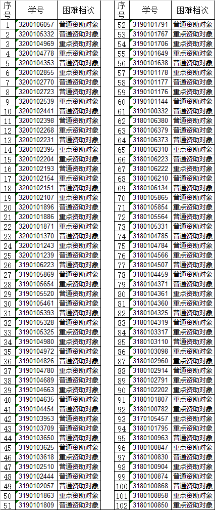 各位同学:根据《浙江大学学生资助管理办法》(浙大发本 〔2019〕162号),已完成资助对象复核与调整的院级审核,现将审核结果公示如下:如有疑问请咨询陈宇烽老师yufeng_chen@zju.edu.cn公示时间:2022/3/7-2022/3/11(3月11日12:00公示结束)机械工程学院团委2022/3/7