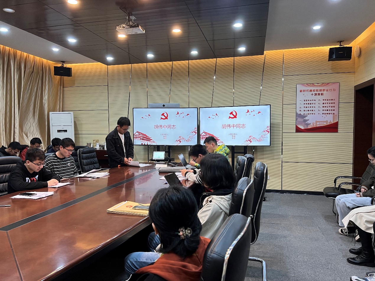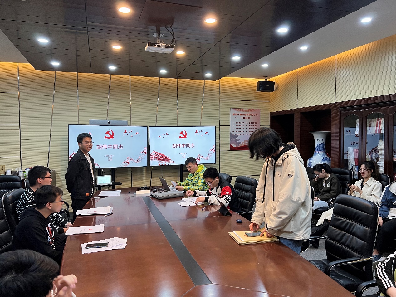大会第一项是关于胡伟中同志发展讨论,2022年3月胡伟中同志发展对象期满3月。会议期间由胡伟中同志宣读入党志愿书以及对自己成为积极分子期间的表现、缺点等发表感悟,并由本支部成员罗佳以及辛宇同志作为入党介绍人宣读意见,以及与会同志的积极讨论,入校后其他党员同志与胡伟中同志的谈话情况汇报,胡伟中同志对于其自身存在问题以及其他党员同志对其建议表态,最后由书记宣布胡伟中同志以全票通过,顺利成为预备党员。