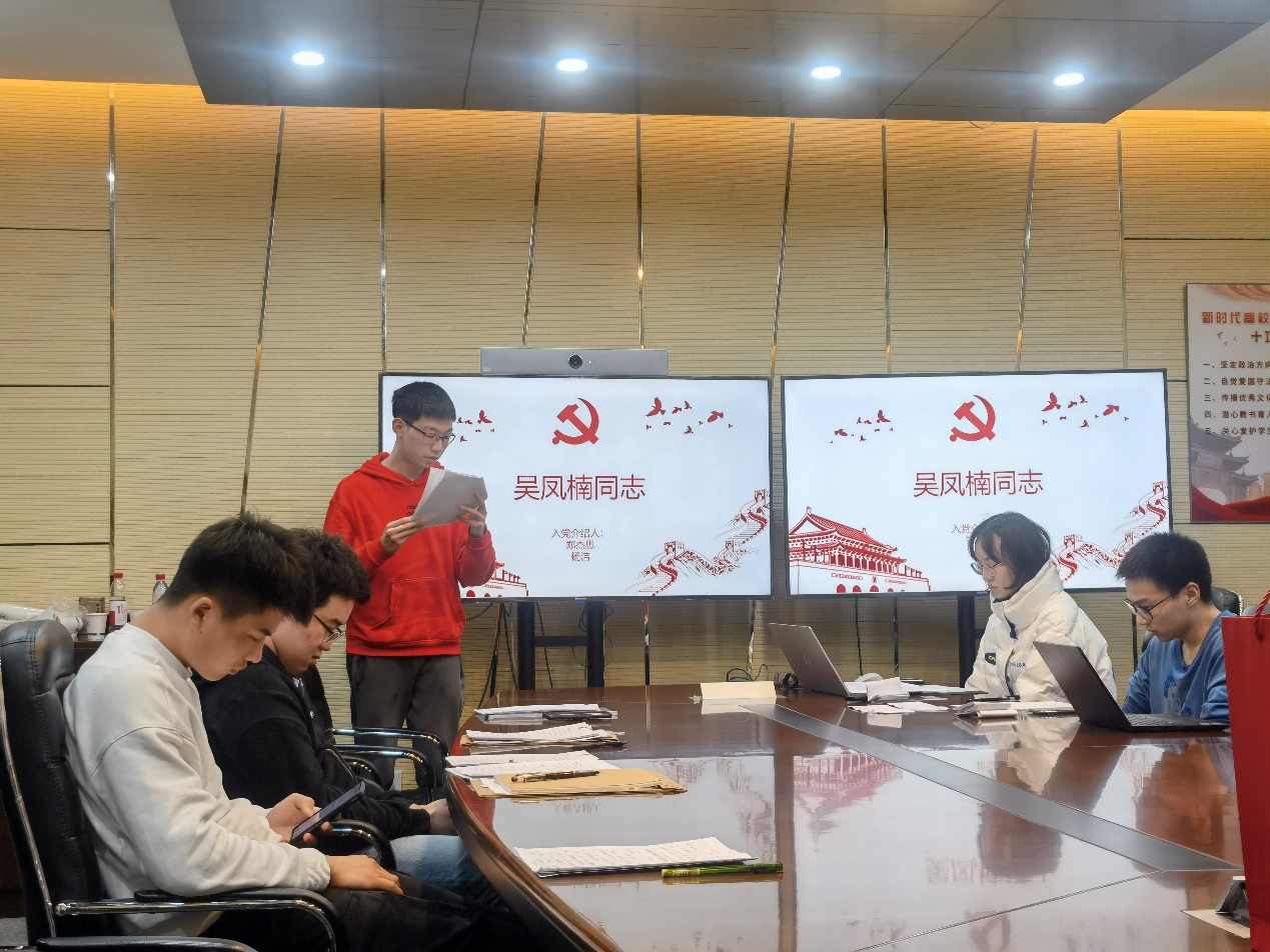 大会第三项是关于吴凤楠同志转正讨论,吴凤楠同志于2022年3月份满预备期一年。会议期间由吴凤楠同志宣读转正申请书以及对自己在转正期间的表现、缺点等发表感悟,并由本支部成员郑杰思以及杨洁同志宣读入党介绍人意见,以及与会同志的积极讨论,入校后其他党员同志与吴凤楠同志的谈话情况汇报,吴凤楠同志对于其自身存在问题以及其他党员同志对其建议表态,最后由书记宣布吴凤楠同志以全票通过,顺利转正。