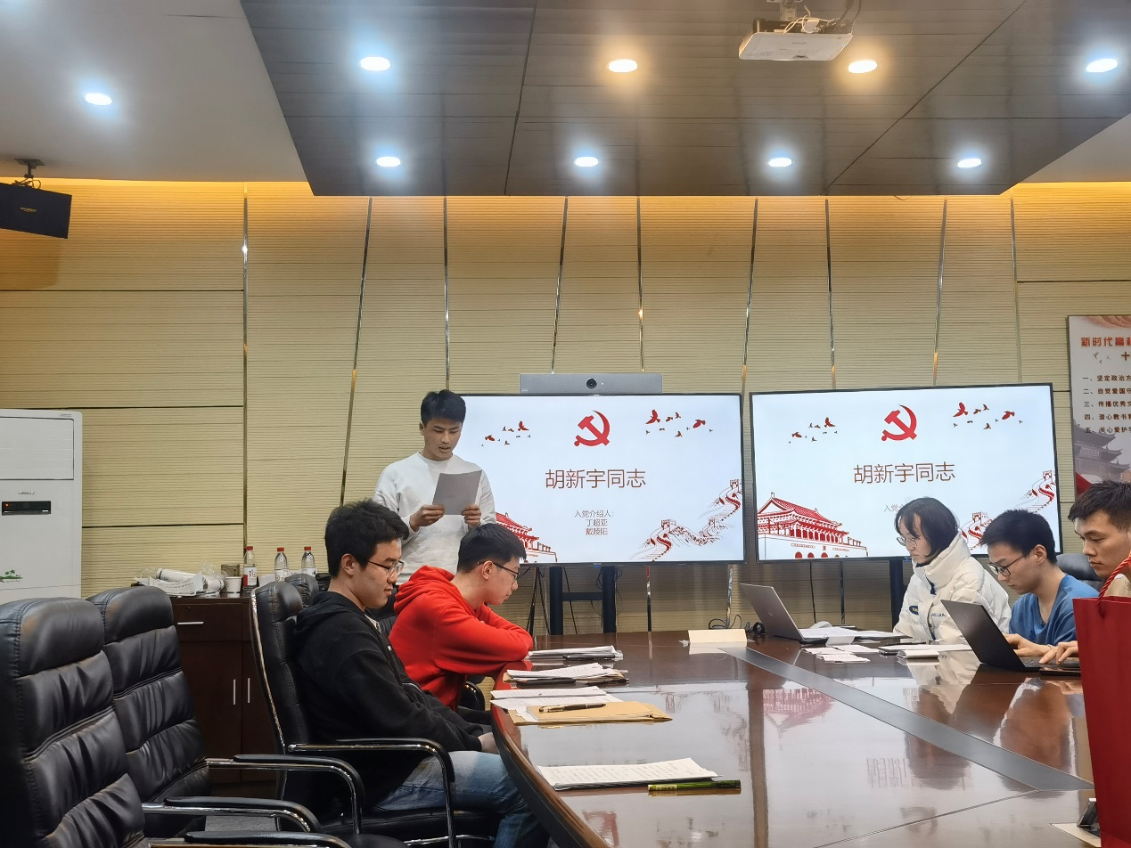 大会第二项是关于胡新宇同志转正讨论,胡新宇同志于2022年3月份满预备期一年。会议期间由胡新宇同志宣读转正申请书以及对自己在转正期间的表现、缺点等发表感悟,并由本支部成员丁超亚以及戴陵阳同志作为入党介绍人宣读入党介绍人意见,以及与会同志的积极讨论,入校后其他党员同志与胡新宇同志的谈话情况汇报,胡新宇同志对于其自身存在问题以及其他党员同志对其建议表态,最后由书记宣布胡新宇同志以全票通过,顺利转正。