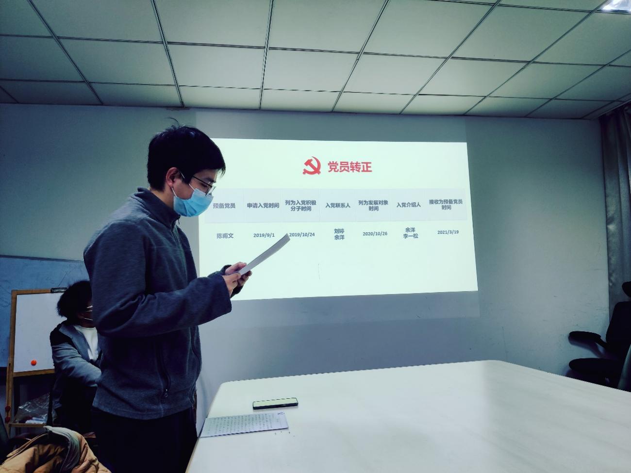 在主题党日活动中,毕业生党员陈甫文作为浙江大学优秀毕业生、浙江省优秀毕业生,向全体党员介绍了自己的读研期间的成长历程,分享了自己在学习、生活及自我管理中的感悟,表达了对母校及党组织教育、培养的感激之情,并向党支部全体正式党员诵读了自己的转正申请,正式成为了一名正式党员。