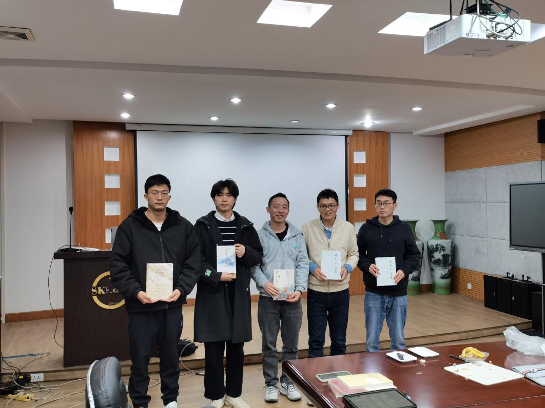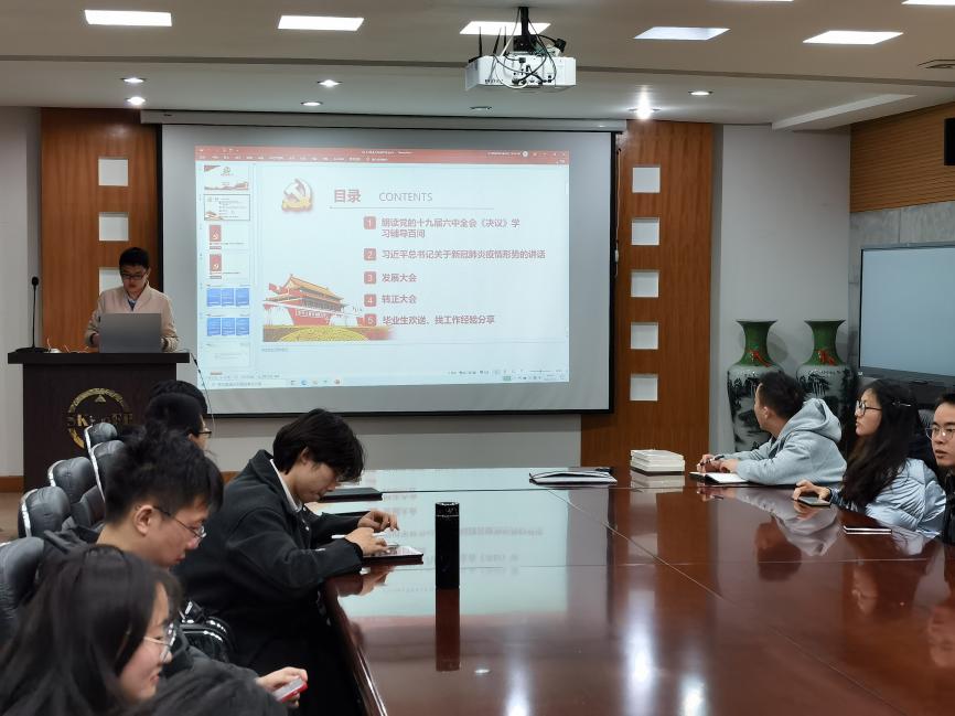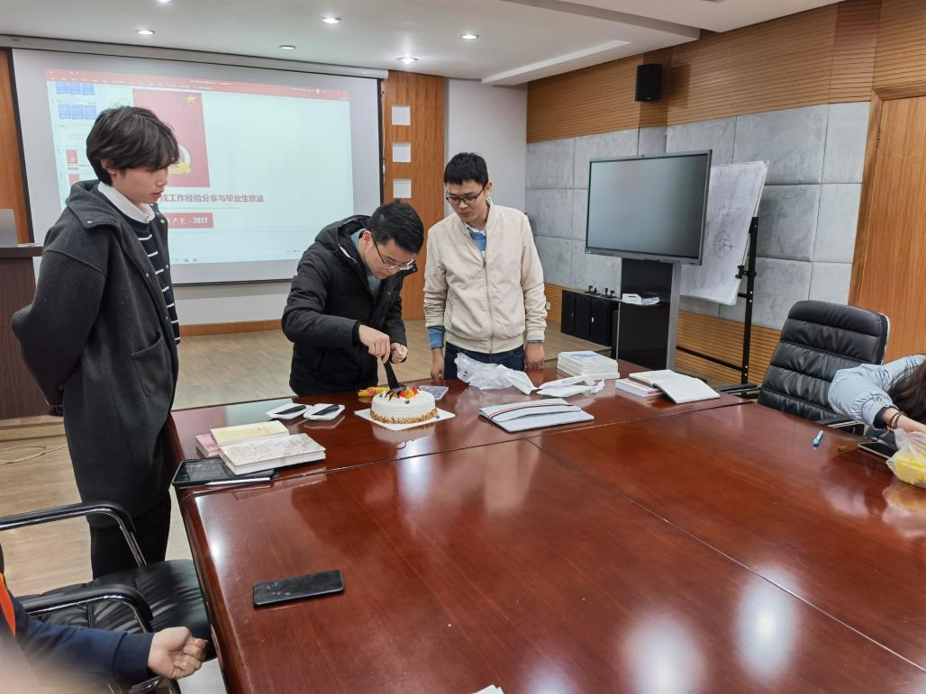 会议第四项,各位毕业生分享自己的求职经验。党支部内毕业生的毕业去向分布在各行各业,王栋同志给大家分享了如何准备选调生考试与面试的经验,杨宇柱同志同大家讲解了求职企业的注意事项以及各个企业求职的情况。无论各位同志去向何处,在各行各业都要发挥党员的先锋作用,希望各位同志都不要忘记初心和使命,坚定理想信念。随后,大家也对毕业生表示祝贺,并送上了礼物。整个活动氛围十分融洽。