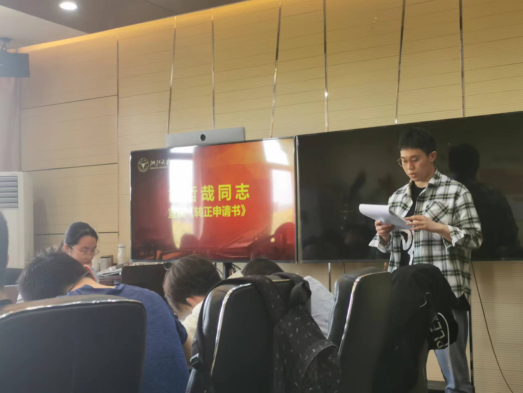 2022年4月9日浙江大学机械工程学院机械工程本科生第二党支部转正大会在浙江大学玉泉校区教一411顺利举行。本次会议由党支部书记詹晨曦同志主持,会议应到党员33人,实到党员32人,应到有表决权的党员11名,实到11名,超过半数,会议有效。