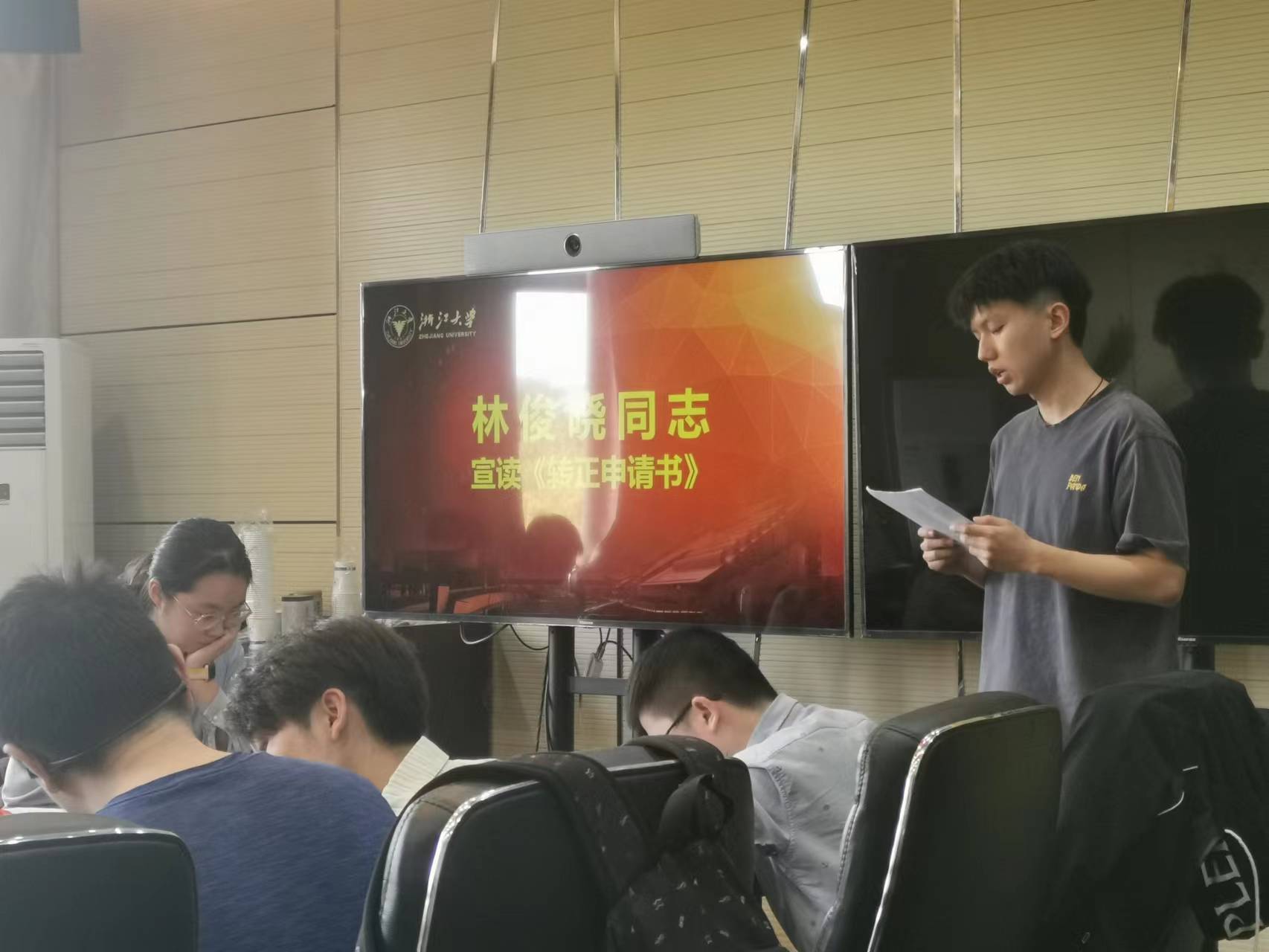 图注:林俊晓同志宣读转正申请书