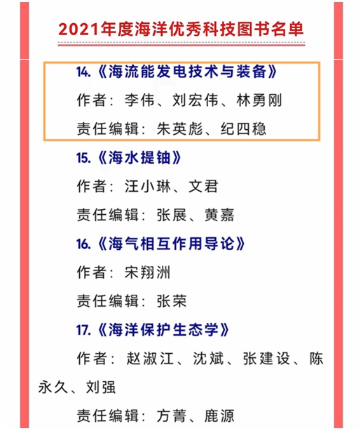 近日,在由中国海洋学会、中国太平洋学会和中国海洋湖沼学会等组织的海洋科学技术奖励委员会第二届第五次会议上,浙江大学机械工程学院李伟教授、刘宏伟教授和林勇刚教授编写的《海流能发电技术与装备》获得海洋优秀科技图书奖。