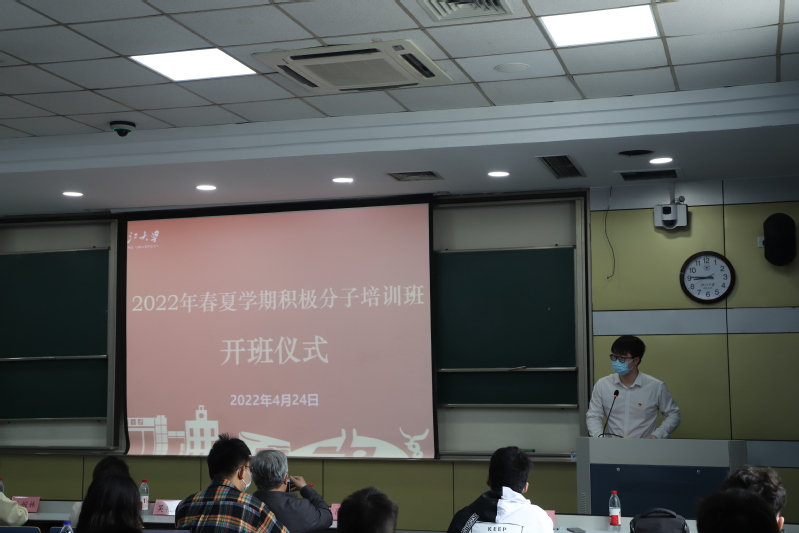 在开班仪式上,浙江大学地球科学学院辅导员牛婉姝老师发表致辞,牛老师肯定了入党积极分子们入党的决心和为人民服务的信念,然后向全体积极分子提出了三点要求:1、认真学习党的基本理论和基本知识;2、扎实学科知识,厚植家国情怀;3、对照党员标准,加强党性修养,并祝愿同学们能早日成为一名真正的共产党员。来自材料科学与工程学院2021级的硕士研究生刘振武和化学系2020级本科生洪森作为入党积极分子代表依次上台发言,真挚诚恳地表达了自己的入党初心,并表示会努力学习党的基本方针、基本路线,以正式党员的标准严格要求自己。