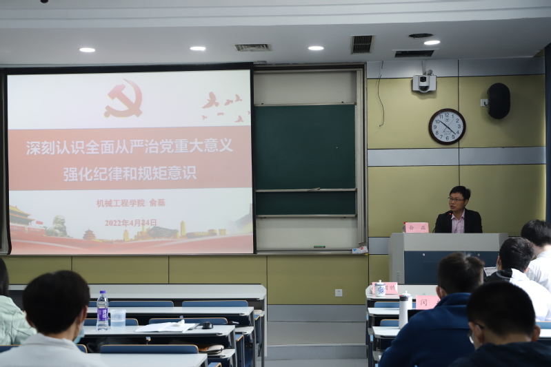 紧接着,浙江大学机械工程学院党委副书记俞磊老师作了《深刻认识全面从严治党重大意义、强化纪律和规矩意识》的专题报告。报告中着重强调了全面从严治党的深刻内涵、党纪律和规矩和大学生要强化纪律和规矩意识。高度赞扬了中国共产党从严治党,以身作则的优良传统与风气,并且引导和鼓舞大学生们以党的纪律和规矩严格要求自己,弘扬浙大精神,践行社会主义核心价值观。有组织、有纪律;才能有希望,有未来。