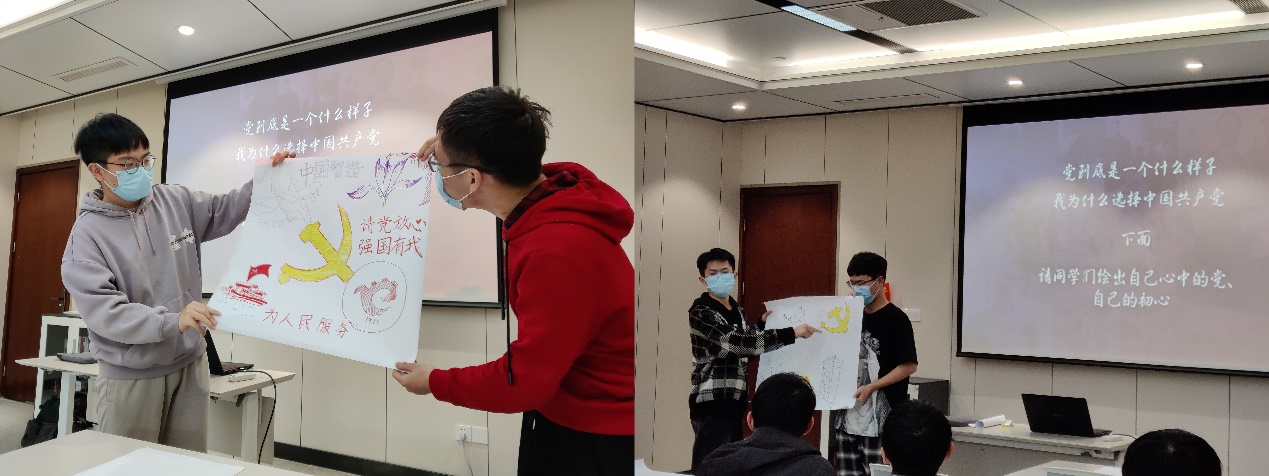 最后,学生发展对象对于“我心中的党”这一主题,回顾自己志愿加入中国共产党的初心,展开了小组讨论,并拿起画笔在纸上绘出了各自心中党的形象。