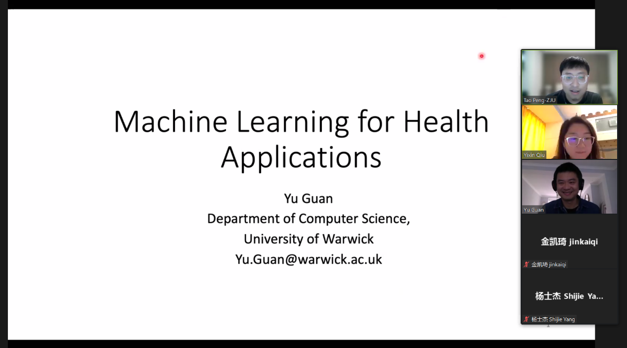 2022年7月21日,应浙江大学机械工程学院邀请,英国华威大学Dr. Yu Guan为我院师生举行了一场线上学术报告会,主题为“Machine Learning for Sensor-based Health Assessment”。报告会由我院彭涛副教授主持,百余名师生线上参加。