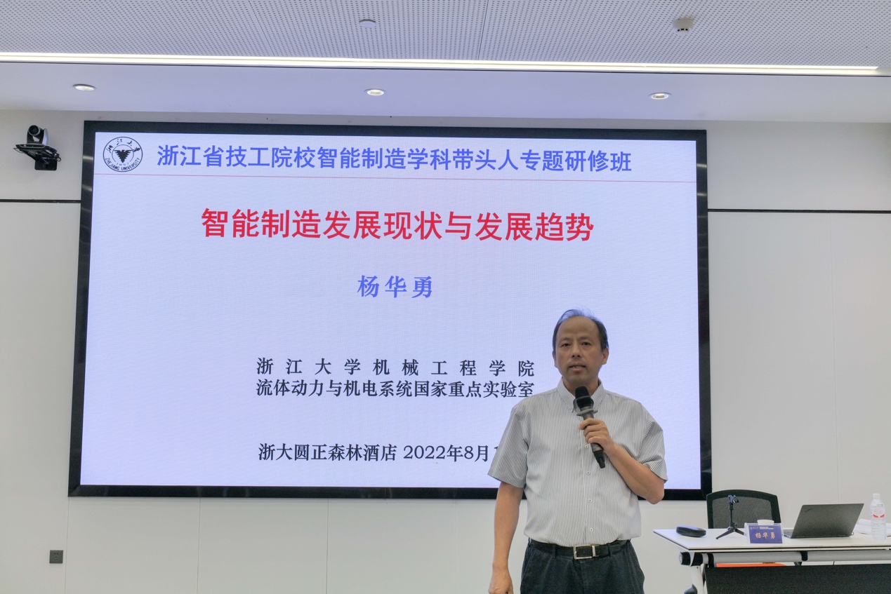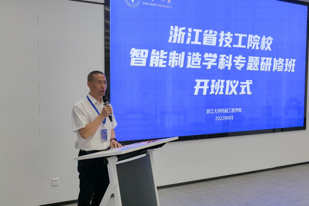2022年8月12日上午,浙江省技工院校智能制造学科专题研修班开班仪式在杭州市浙大森林小镇举行。中国工程院院士、浙江大学工学部主任、机械工程学院原院长杨华勇、浙江大学机械工程学院党委书记项淑芳、常务副院长居冰峰、副院长刘振宇、院长助理王柏村等出席,活动由学院副院长赵朋主持。