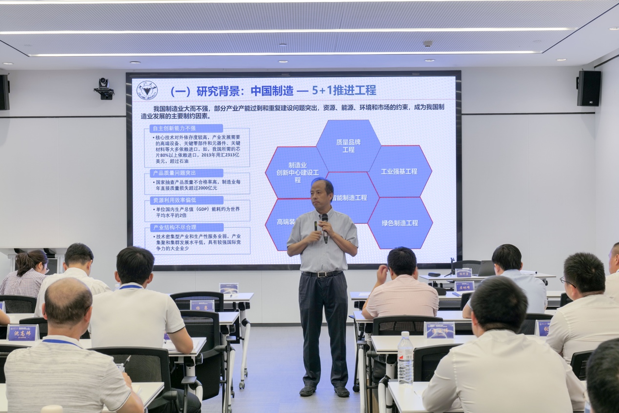 随后,中国工程院院士杨华勇为学员们做首场“智能制造发展现状与发展趋势”主题报告,杨院士从制造业智能化转型、工业互联网实践思路、工业典型案例、大飞机制造大脑四个方面,从理论到案例,从现状不足到发展趋势为学员们全面介绍了当前国内智能制造的发展历程与重心,并为同学们列举了许多工程实践中的具体案例,学员们积极互动,收获颇丰。