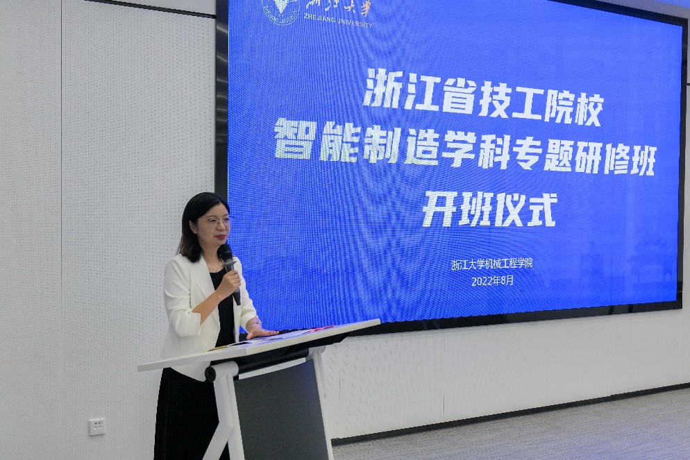 项淑芳在致辞中指出,此次专题研修班是在省人社厅的大力指导下,积极响应习近平总书记强调的大力发展技工教育,浙江省委提出的完善技工教育体系的一个重要举措,研修班围绕智能制造创新发展多层次人才培养需求,充分发挥浙江大学机械工程学院学科优势及各类实训平台资源,注重理论学习、观摩体验和专题研讨相结合,精心设计和安排培训课程,希望能够进一步提升省技工院校智能制造学科师资力量和水平,助力智能制造人才培养和产业发展。