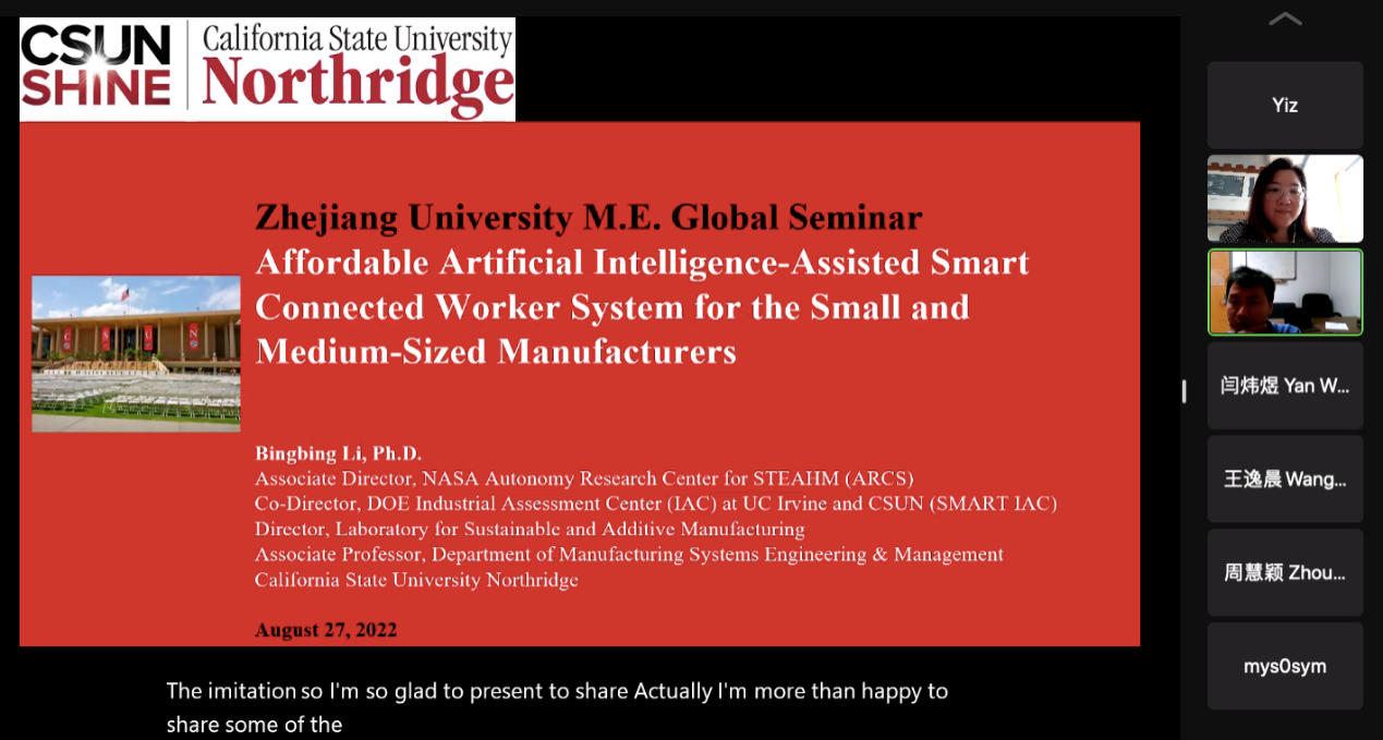 2022年8月27日上午,应浙江大学机械工程学院邀请,美国加州州立大学北岭分校副教授Bingbing Li为我院师生举行了一场线上学术报告会,主题为“Affordable Artificial Intelligence-Assisted Smart Connected Worker System for the Small and Medium-Sized Manufacturers”。报告会由我院祝毅副教授主持,来自我院近百名师生线上参加。