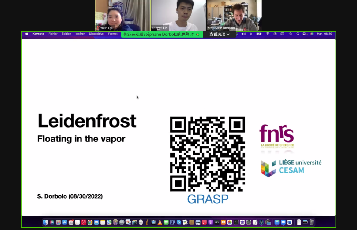 2022年8月30日下午,比利时列日大学Stéphane Dorbolo教授为我院师生举行了第二场线上学术报告会,第一场Dorbolo教授介绍了液滴的基本物理性质及其广泛的应用。本期为第二场继续深入了解两类悬浮滴,开展了主题为“Ⅰ.The Leidenfronst effect: from basic to complex systems/Ⅱ.Antibubble: How it works?”的精彩报告。报告会由我院邹俊教授主持,我院近百名师生线上参加。