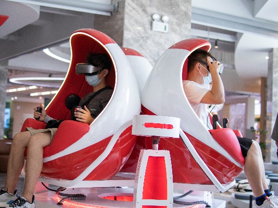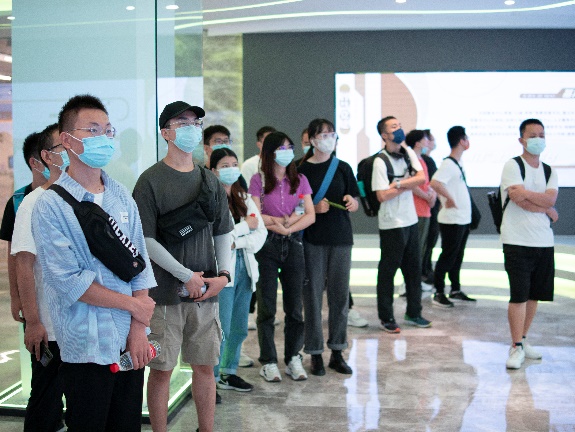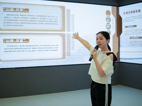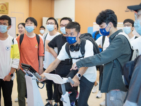 随后一批新生同学在党建基地讲解员的带领下参观了青山湖科技城党群服务中心。讲解员给大家生动地讲解了智慧云馆、积分超市、青山驿站、生活运动馆等中心智慧化载体和相关功能区块的建设运行情况。参观过程中,同学们体验了党群服务中心的特色活动设备。大家不仅可以在室内体验骑行的快乐,一览青山湖绿道的美丽风景;还能穿戴上科技感十足的沉浸式VR设备,在虚拟世界中感受长征的漫漫征途,重温党的百年发展历程。