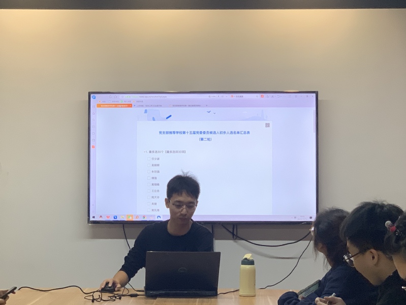 会议的第一项内容为学校党代会换届选举两委委员候选人第二轮酝酿推荐及党代表候选人酝酿推荐,由党支部副书记曹宇恒同志主持。