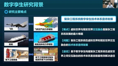 在数字孪生研究背景部分,胡教授首先指出目前该领域研究的难点、问题以及解决途径,然后依次介绍了数字孪生的概念和发展历程。