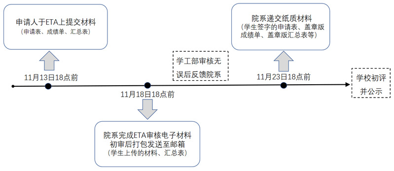 2. 11月21日18:00前,外设助学金校级工作人员将对学生材料进行审核,申请同学打印申请表(签字、盖院系章)、成绩单(成绩专用章)等相关材料(均为一式两份)送至开物苑1幢409陈宇烽老师处。