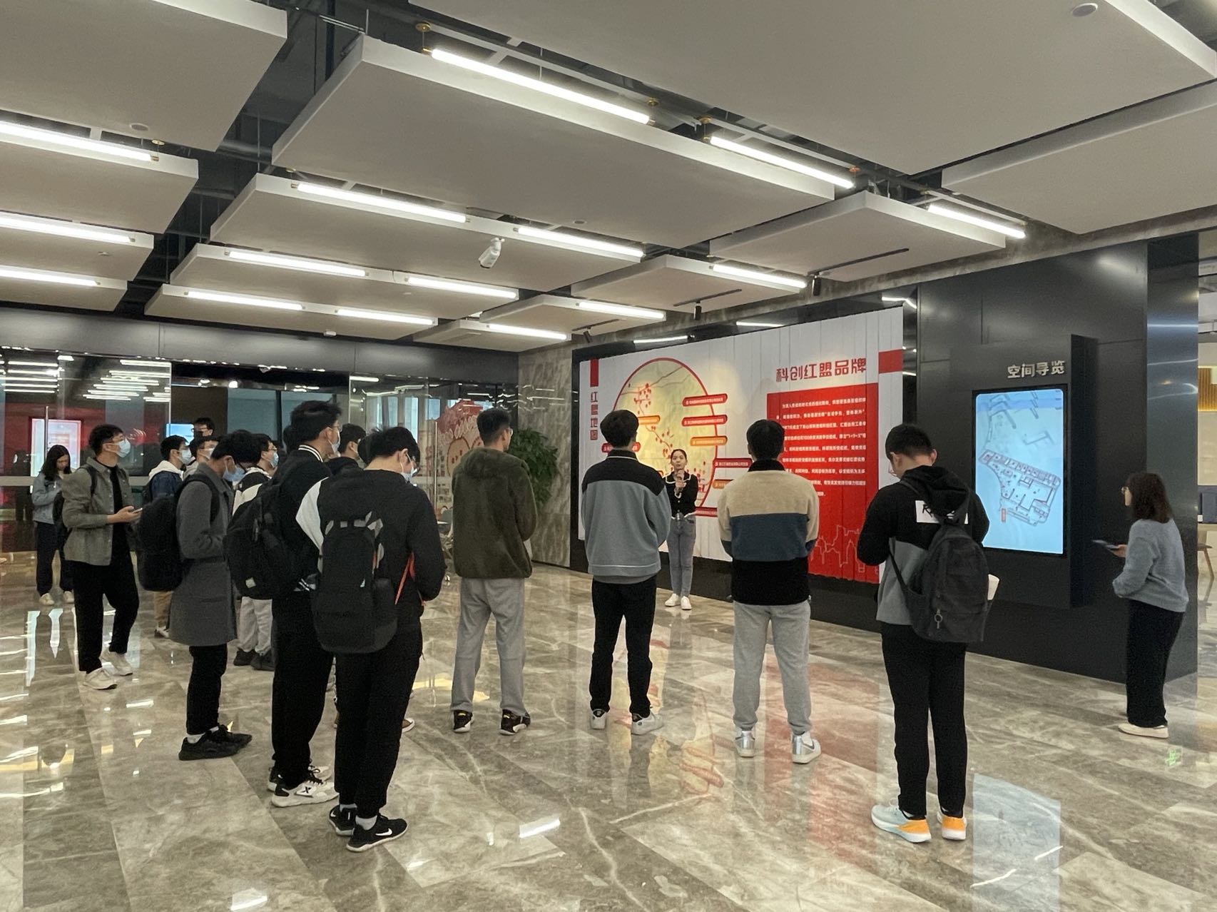 图注:讲解员为预备党员们讲解党群服务中心相关活动