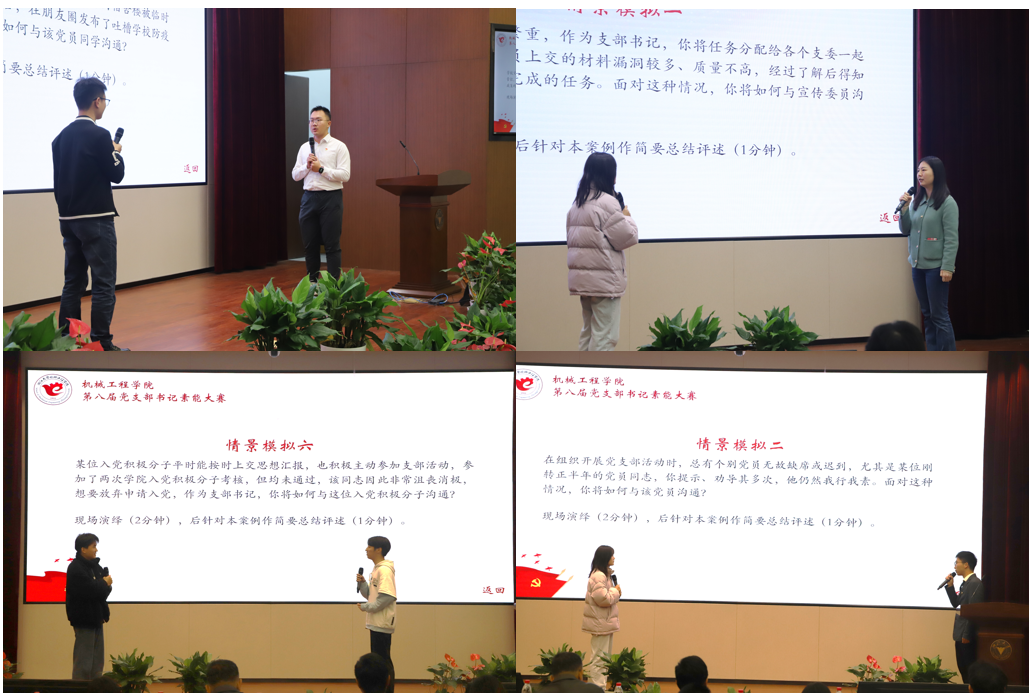 本次大赛决赛分为两个环节,分别是党支部组织生活案例展示和情景模拟环节。党支部组织生活案例展示主要以展现支部组织生活的特色形式和丰富内涵为目的,为学生党建工作树立标杆,积累经验。情景模拟主要考验支部书记们在党建工作中遇到特殊情况时的临场应对和应急处理能力。