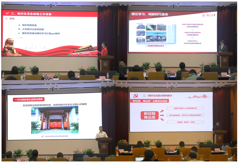 决赛邀请机械工程学院党委副书记俞磊老师、退休教师党支部书记朱聘和老师、团委书记金娟霞老师、团委副书记刘炳瑞老师、李灵老师、陈宇烽老师及浙江大学第九届研究生党支部书记素能大赛一等奖得主赵金栋同志担任本次比赛评委。预赛中共有七名优秀的学生党支部书记凭借精彩的表现脱颖而出,成功晋级本次决赛。决赛由机械工程学院研究生党员田野同志主持。
