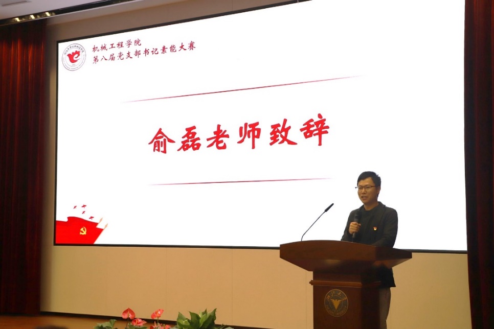 赛前,学院党委副书记俞磊老师致辞,他强调:在党的二十大刚刚落下帷幕的特殊背景下,学院举办本次大赛意在以赛促学强本领,以赛促行展风采,为学院学生基层党建提供了可学习、可参考的模型和样板。同时也希望借此给各位学生支部书记提供成长的平台和锻炼的机会,对落实基层党支部学习贯彻党的二十大精神做出部署。