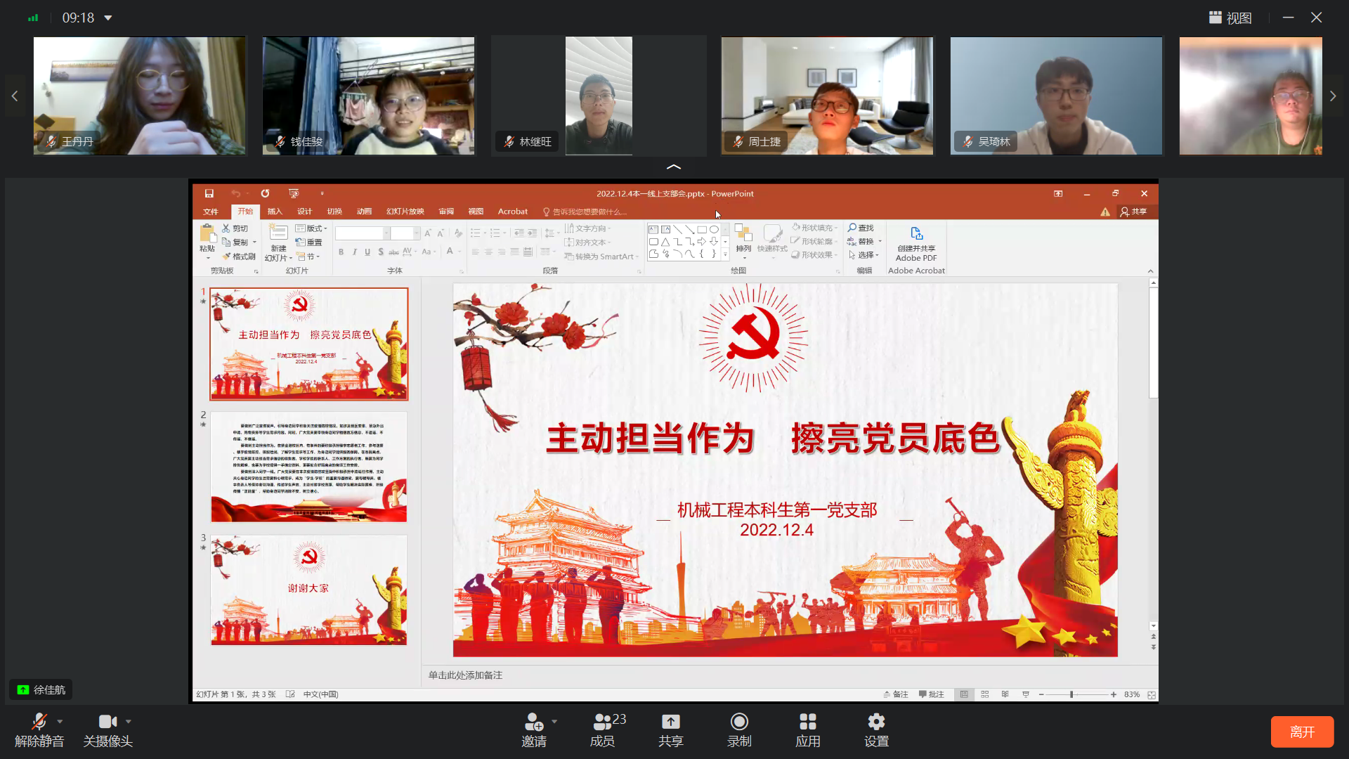 为进一步深化学生对当前学校疫情防控工作的认识和理解,万众一心、众志成城、咬紧牙关、共克时艰、互帮互助、同闯难关,机械工程学院本科生第一党支部于12月4日晚举办以“主动担当作为,擦亮党员底色”为主题的线上主题党日。机械学院本科生第一党支部共23人与会,会议由徐佳航副书记主持。