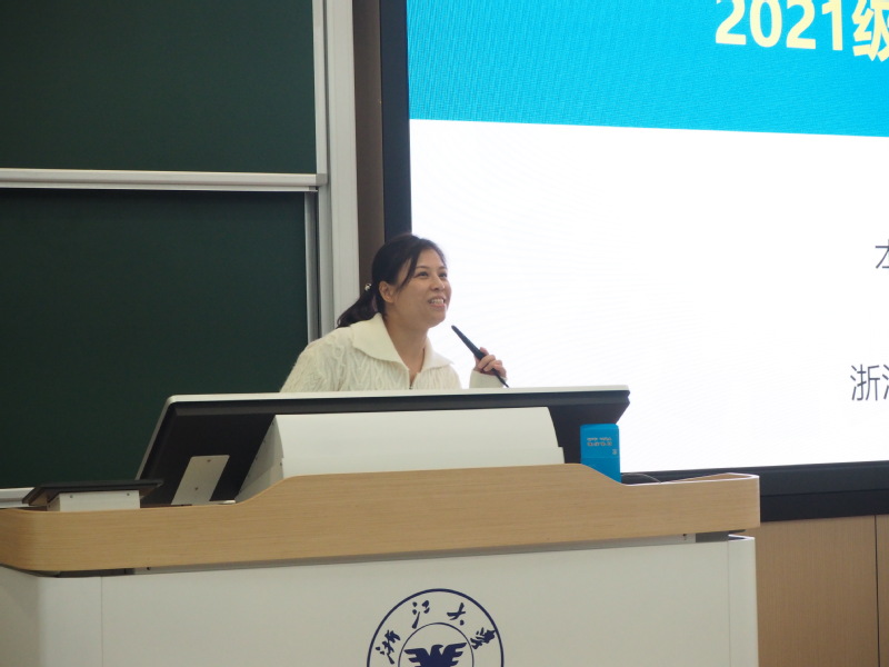 项淑芳老师首先致欢迎词,对2021级本科生的到来表示祝贺与欢迎。她介绍了浙江大学机械工程学院的发展概况,讲述了学院111年的办学历程。在学院的建设历程中,涌现出了一大批杰出的科学家,他们为祖国的发展做出了重要贡献。追寻前辈足迹,项老师对同学们提出了以下四点期望:第一,扎实学术基础;第二,积累学术经验;第三,加强课外实践;第四,培养家国情怀。项老师强调,二十大提出了“加快建设制造强国”的目标,这是国家最需要同学们的时候,也是同学们大有可为的黄金时代,我们应当以过去的杰出校友为榜样,牢记时代的使命,努力学习,艰苦奋斗。