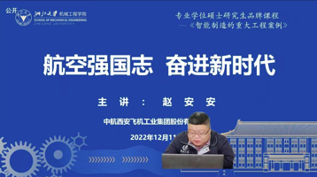 航空航天产业是国家综合国力的集中体现和重要标志,是推动国防建设、科技创新和经济社会发展的战略性领域。12月11日,受浙江大学机械工程学院所邀,来自中航西安飞机工业集团股份有限公司的总工程师赵安安在线上为机械专业硕士研究生讲授智能制造前沿课程《智能制造的重大工程案例》,讲述我国航空产业发展现状与航空工业中的重大工程案例。该系列课程面向国家重大战略需求,旨在培养学生的家国情怀和使命担当,以实际工程案例出发,让同学们熟悉智能制造相关产业与技术,为科研学习提供一定的思考与启发。