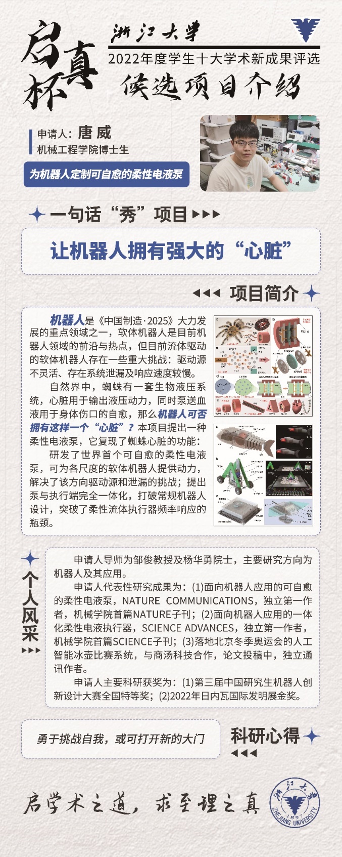 2022年12月31日,机械工程学院第九届学生科技文化展以推文形式在线上举办,推文发布在“浙大机械青年”公众号。本次学生科技文化展是在浙江大学机械工程学院团委的指导下,由机械工程学院团委学生科技创新中心承办。活动以“乘科技之风,创青春之梦”为主题,旨在激发同学们的科研竞赛热情,并促进各大实验室/学院之间的科技交流,同时为学院营造浓厚的创新创业氛围。
