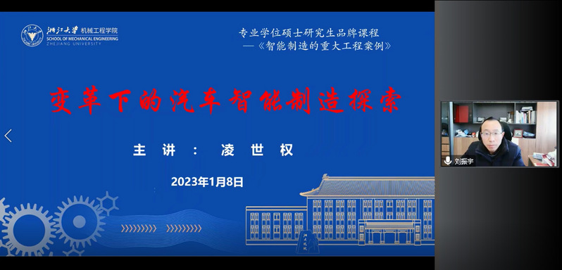 2023年1月8日,受浙江大学机械工程学院的聘请,吉利汽车控股集团有限公司副总裁、雷达汽车CEO凌世权为浙江大学机械大类的研究生们做了一次精彩的学术报告。本次报告的题目是《变革下的汽车智能制造探索》,这也是浙江大学机械工程学院开设的智能制造前沿课程《智能制造的重大工程案例》中的最后一节课,该系列课程均以智能制造领域走在前沿的企业、集团中的重大工程实践案例为授课的主线,在对实际案例的剖析与讲解中,为同学们讲述智能制造相关技术与发展现状,并结合社会、国际上的发展趋势,让同学们对智能制造的整体形势、关键技术和难点有大致的了解。