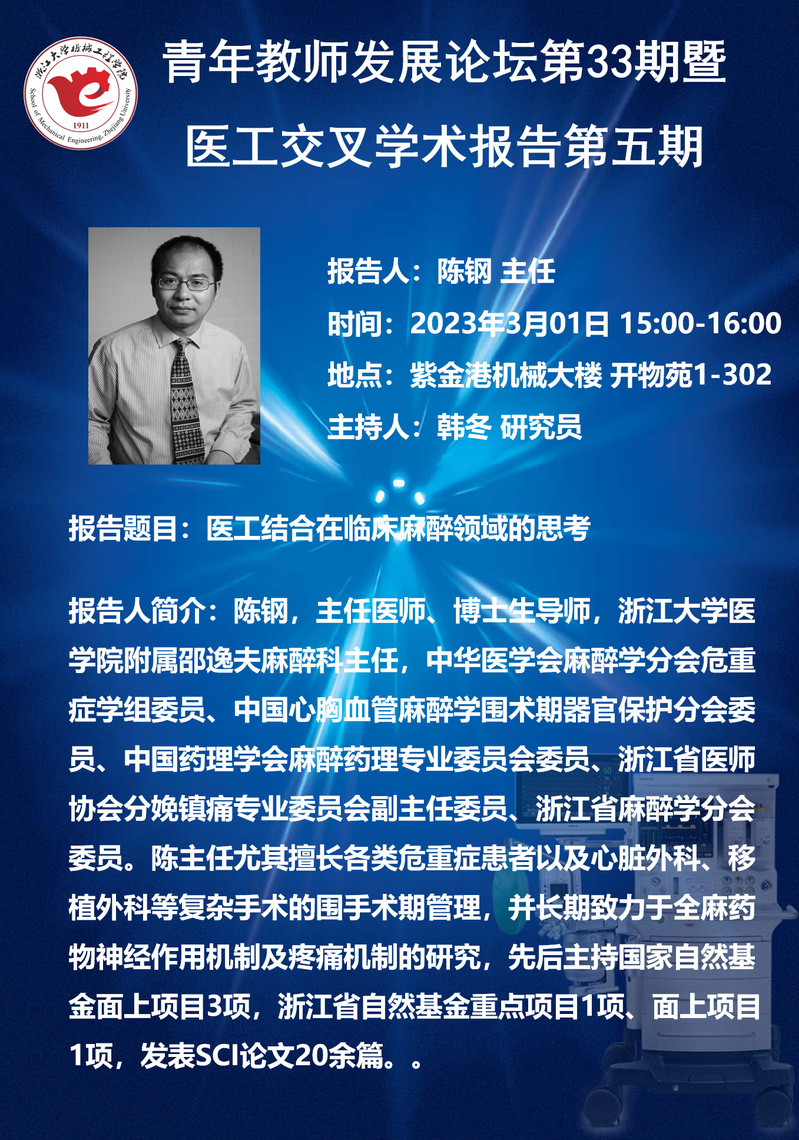 浙江大学机械工程学院青年教师发展论坛第33期暨医工交叉学术报告第五期——浙江大学医学院附属邵逸夫医院麻醉科陈钢主任学术报告
