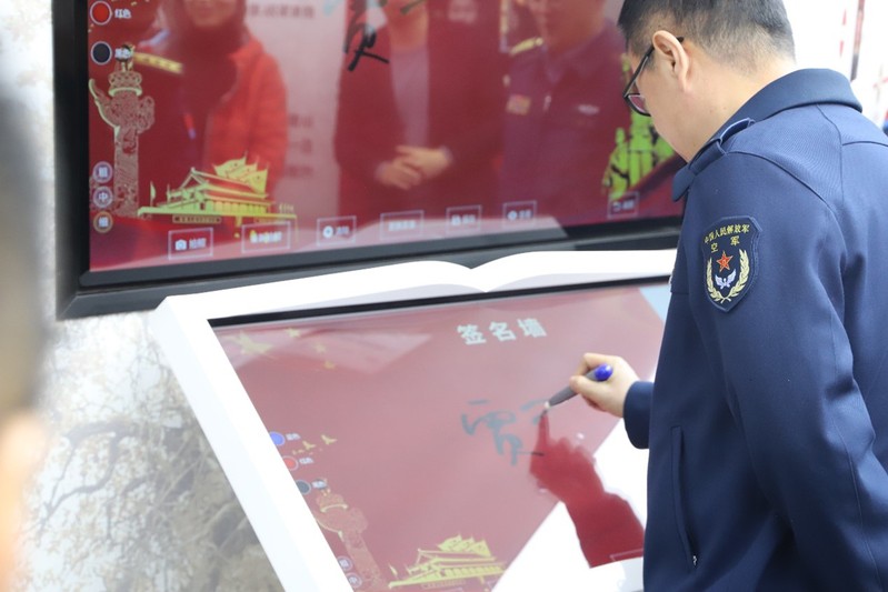 随后中国人民解放军空军研究院代表在电子签名墙上签字留念。