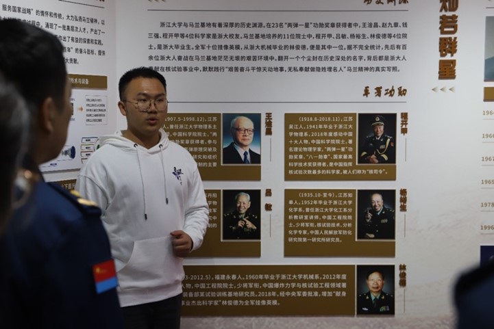 讲解员石大杭从马兰基地的历史由来到历次核试验的开展情况,从王淦昌、程开甲等“两弹一星”的功勋事迹,到1960届校友林俊德的感人事迹,向嘉宾们讲述了一代代浙大马兰人物故事,深入介绍了“艰苦奋斗干惊天动地事,无私奉献做隐姓埋名人”的马兰精神。