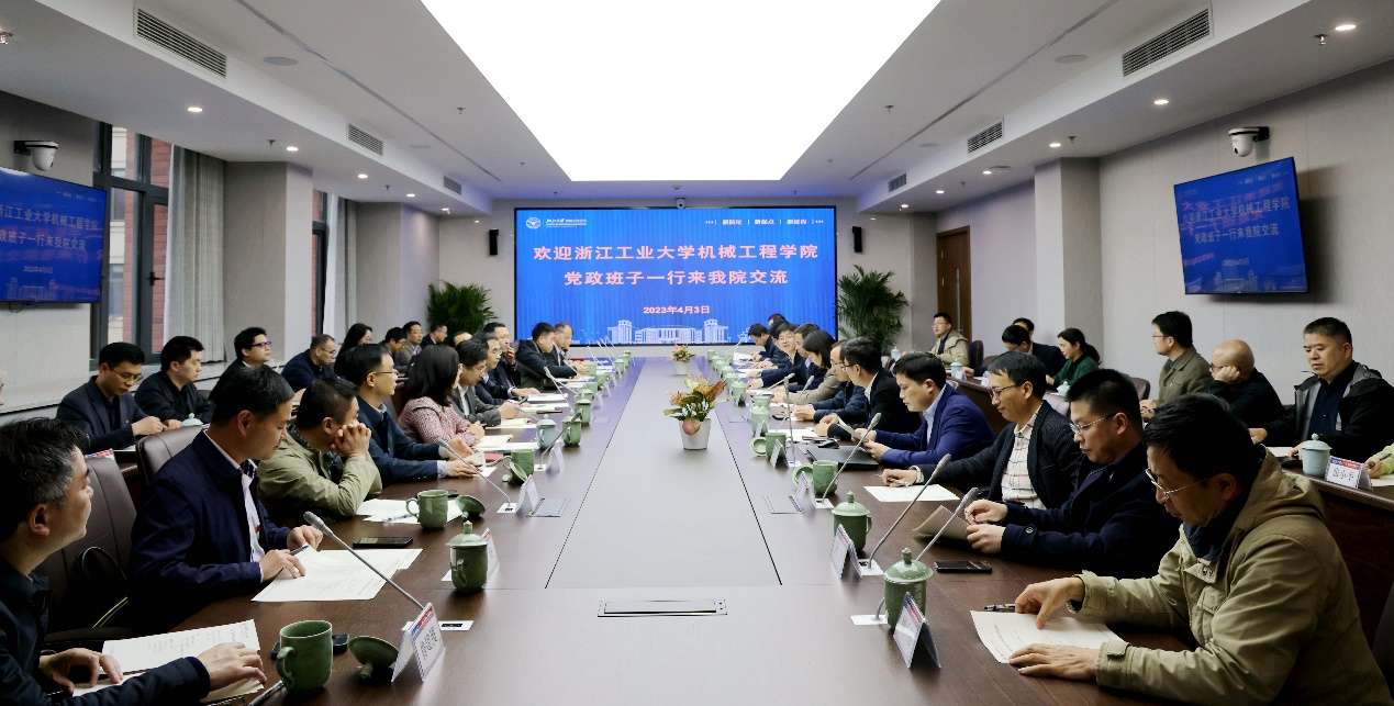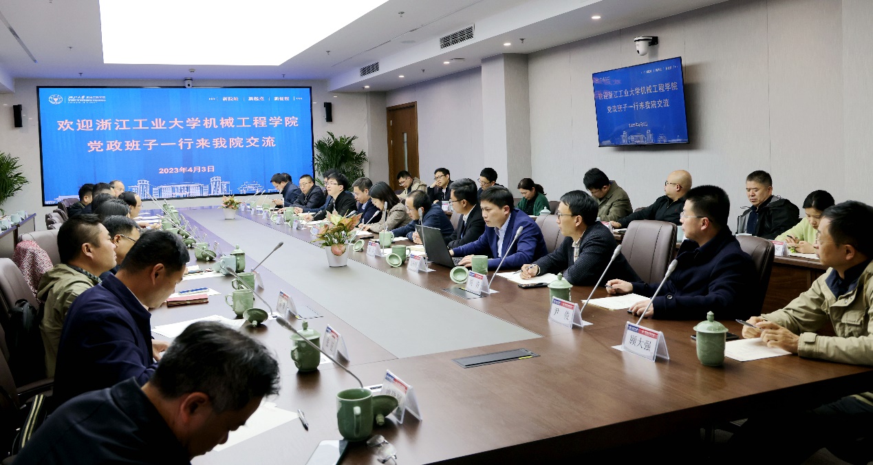 2023年4月3日,浙江工业大学机械工程学院党委书记潘柏松、院长姚建华带领党政班子成员等一行25人来我院交流,学院党委书记项淑芳、常务副院长居冰峰等学院党政班子、系所中心负责人、教工支部书记等参加座谈,会议由学院副院长赵朋主持。